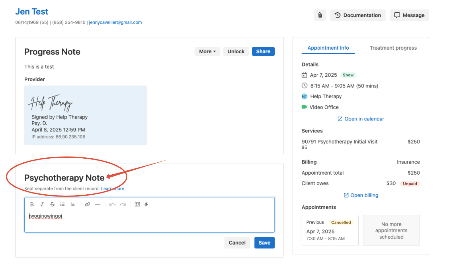If you don’t want to unlock the note, but want to add additional information you can add additional psychotherapy notes by following the process above and instead of selecting the progress note editing the psychotherapy note.